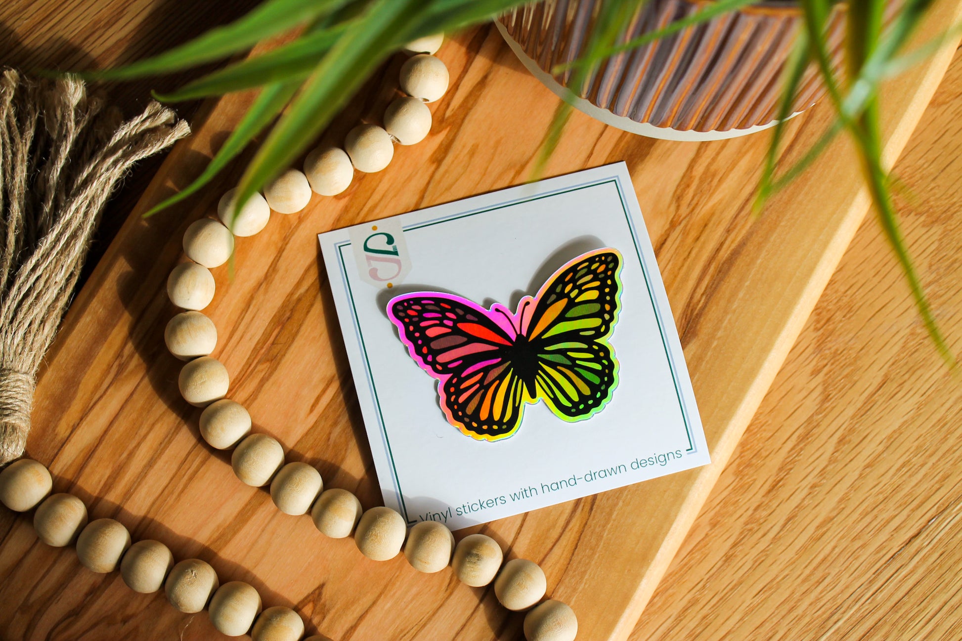 Get ready to flutter around with this butterfly holographic sticker that shines bright! Experience a magical transformation with this vibrant butterfly holographic sticker. Let your creativity take flight and add some sparkle to your life.Place it somewhere to bring you happiness and make you smile.