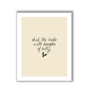 This 8×10 print is not your average Christmas print. Featuring a neutral colour palette and beautiful hand-lettering of the phrase "deck the halls with boughs of holly", this print is subtly festive. Display on its own or pair it with others to form a trio or gallery wall.