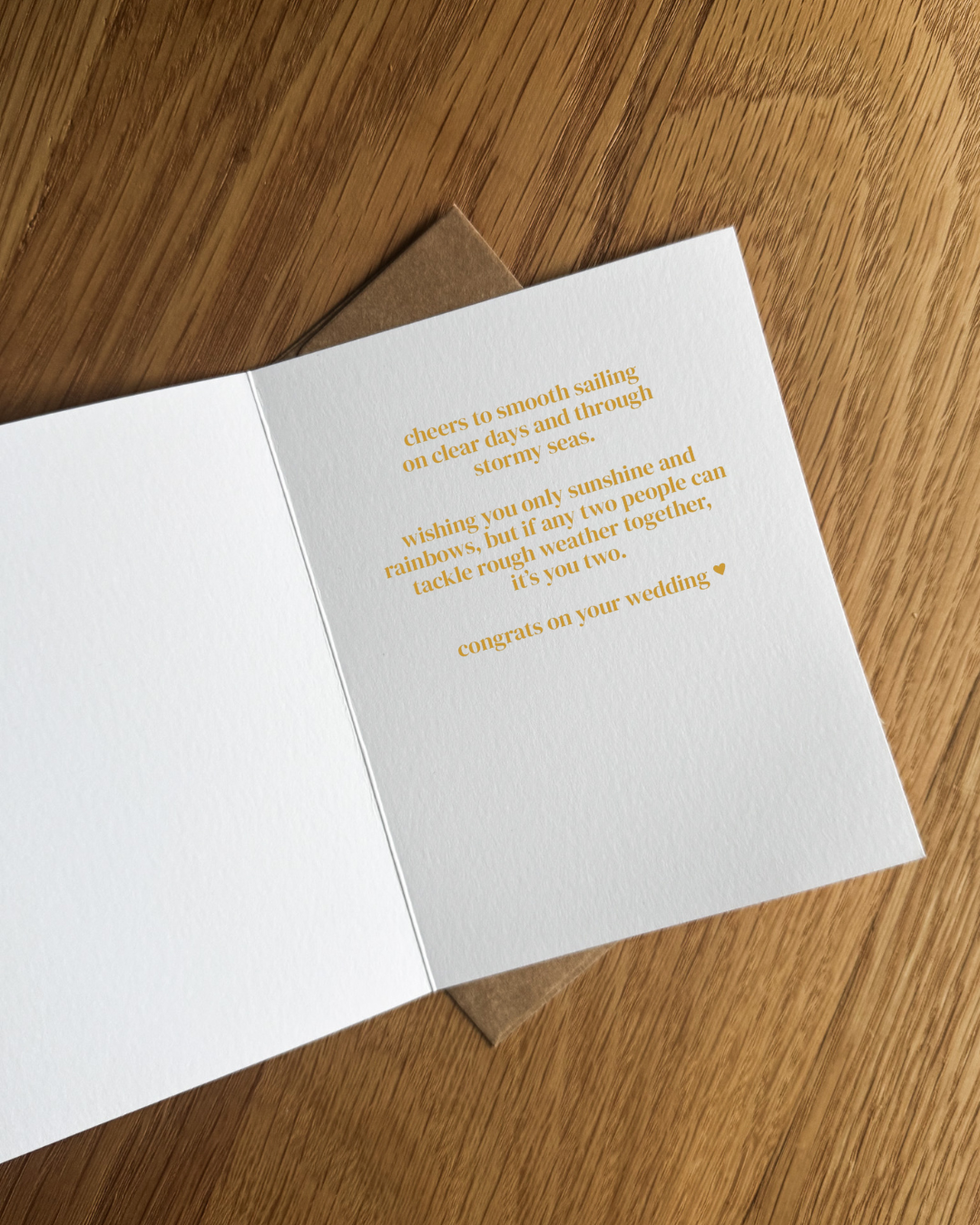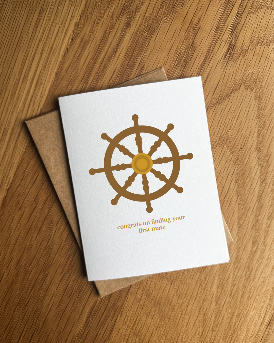 Celebrate love with this playful First Mate Wedding Card. Perfect for the couple who’s found their perfect partner in life’s adventure, it adds a fun nautical twist to your heartfelt congratulations. A charming way to wish them smooth sailing ahead!