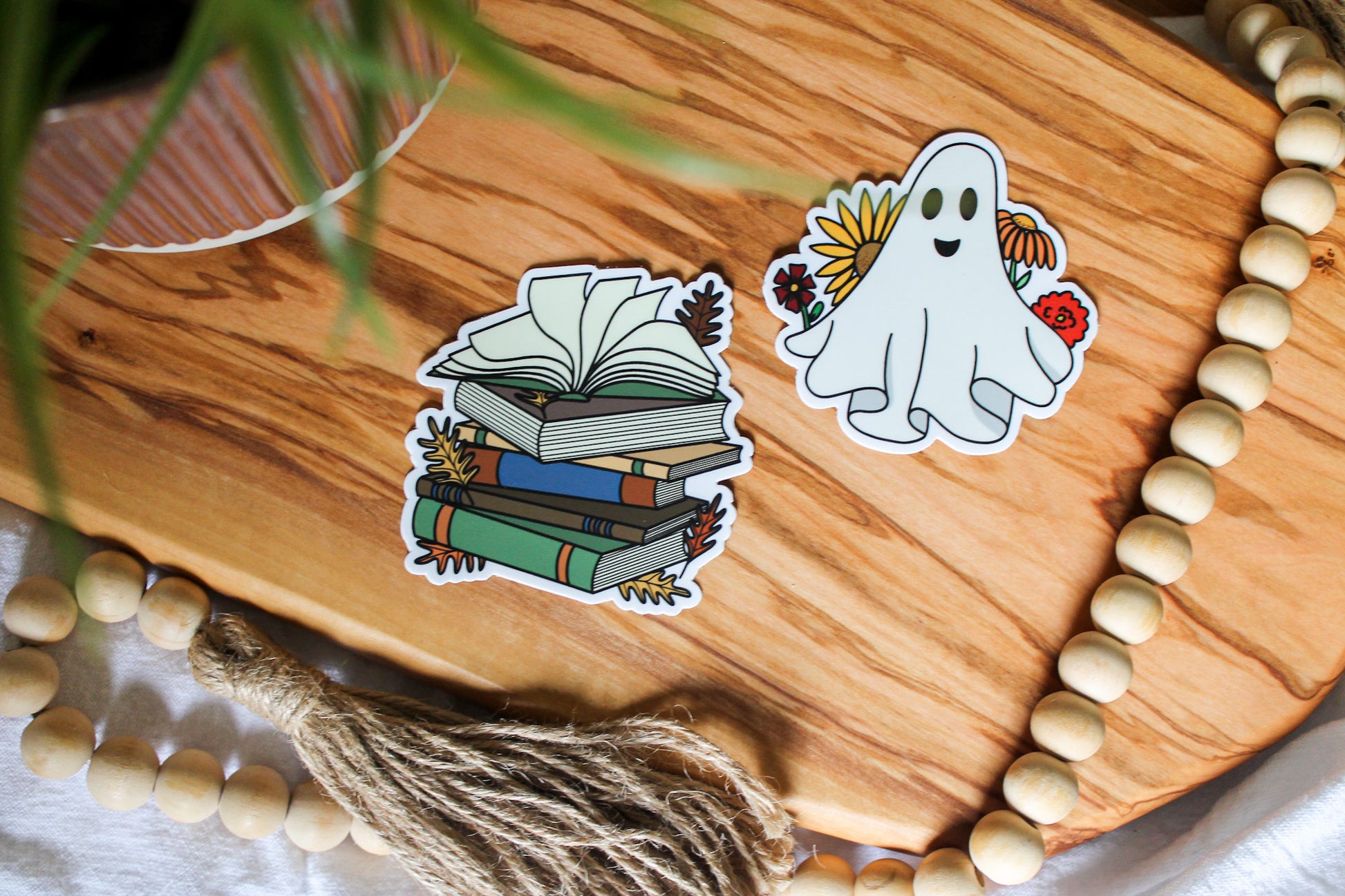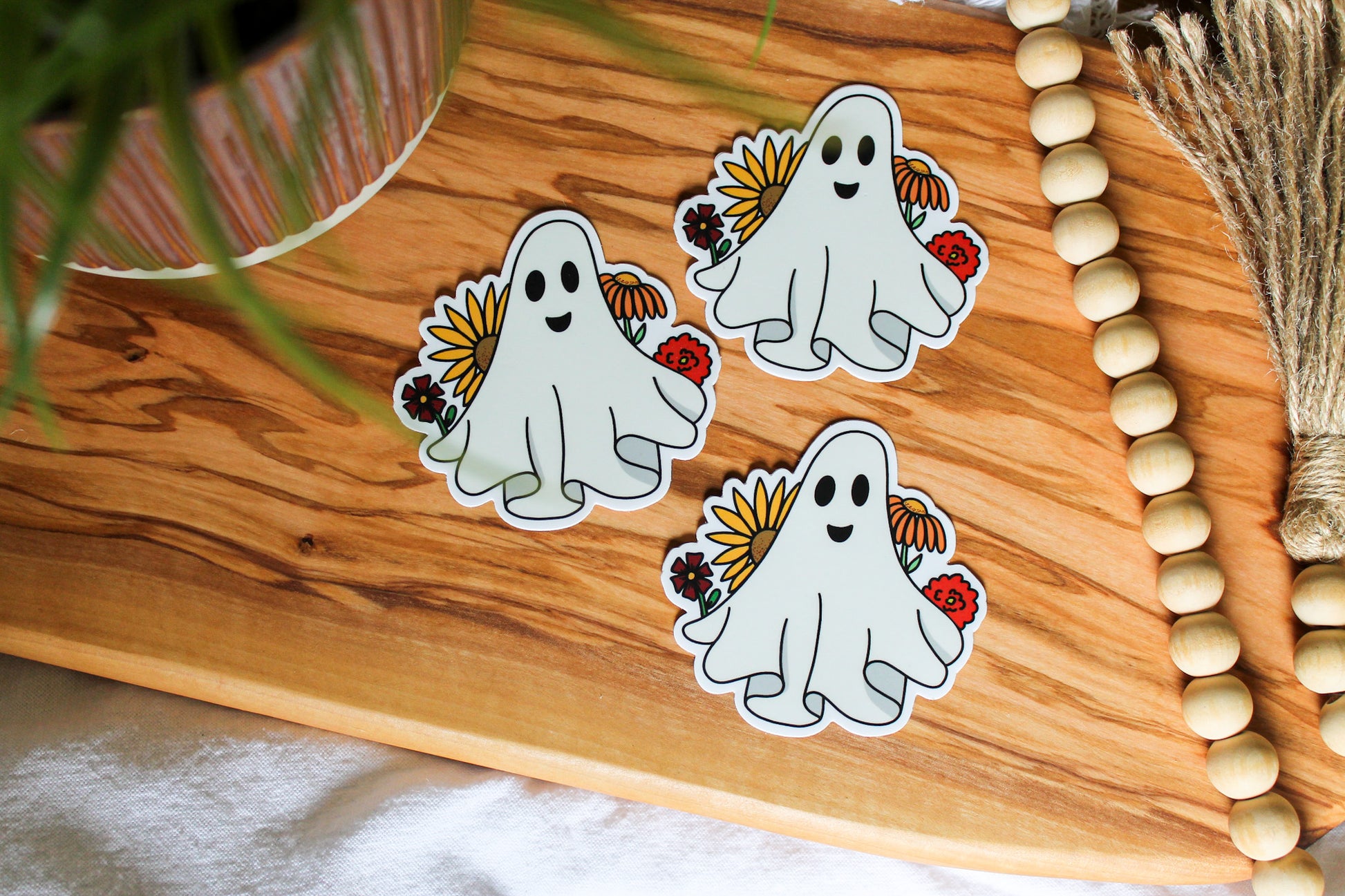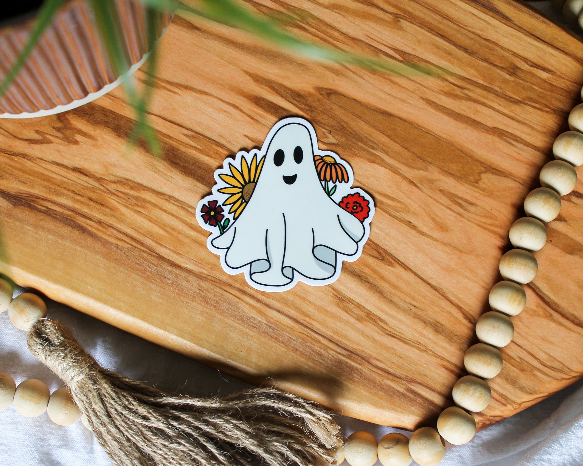 This cute sticker features a hand-drawn happy ghost with flowers around. Place it somewhere to bring you happiness and make you smile. Measures 3x2.91".
