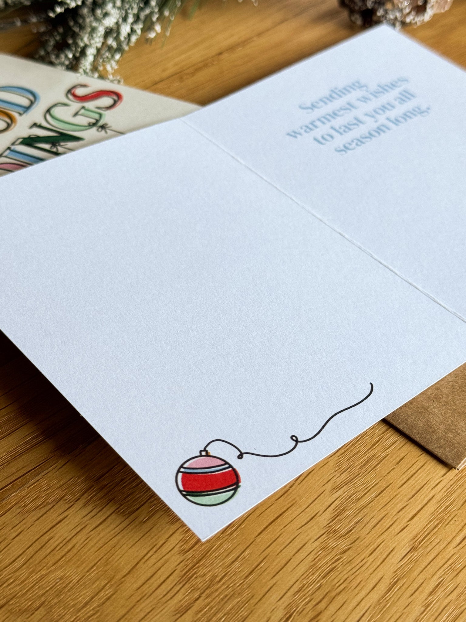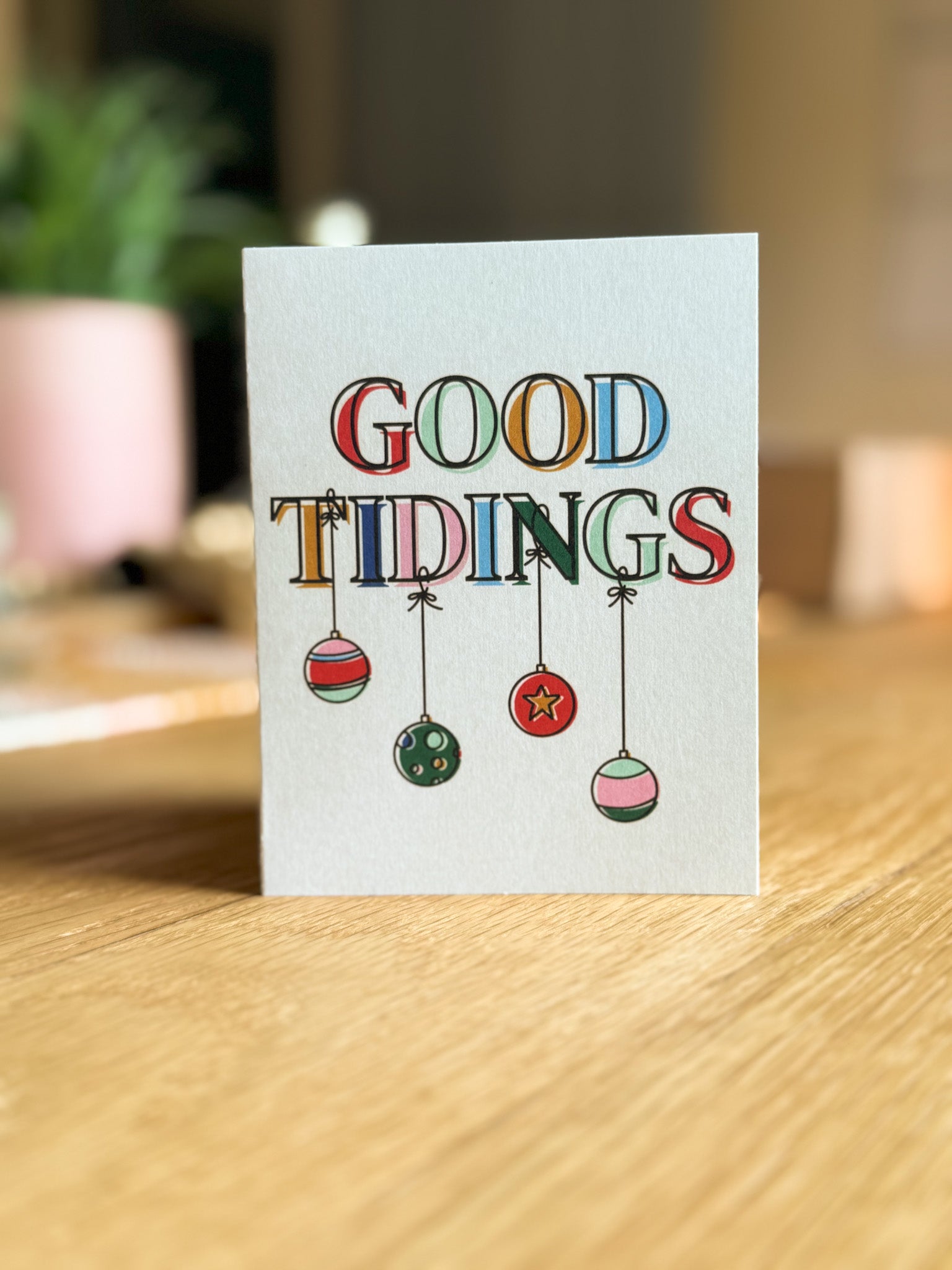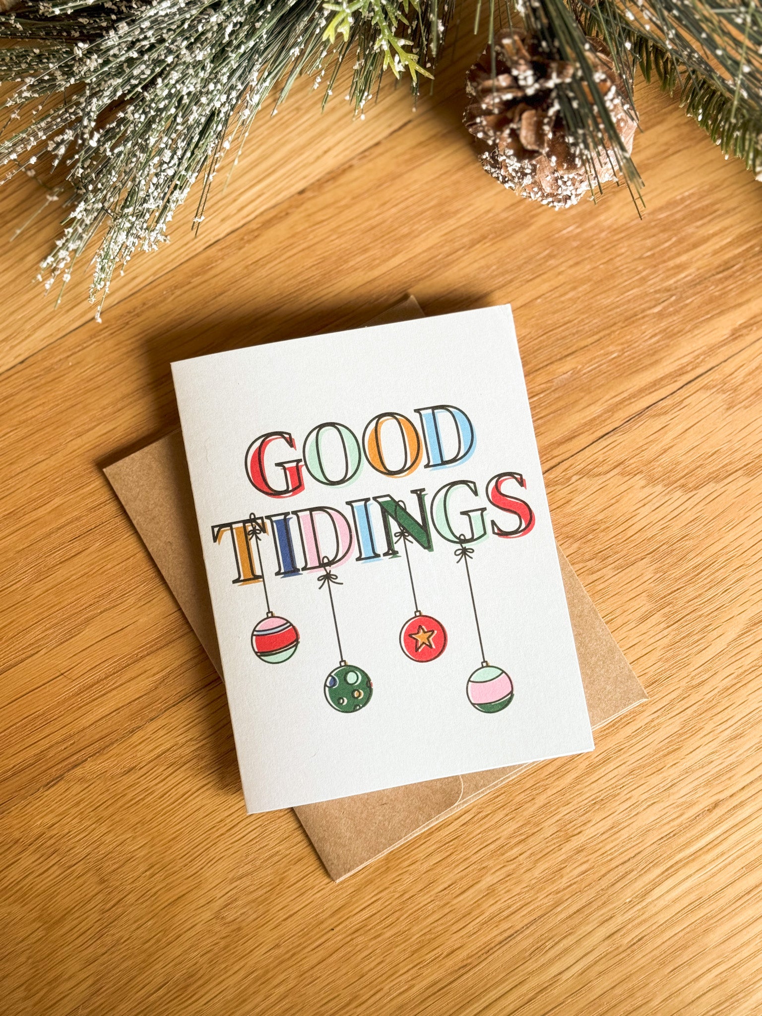 Spread cheer and good vibes this holiday season with our Good Tidings Holiday Card from the 2024 Christmas Card Collection. With festive ornaments and a heartfelt message, this Christmas card will bring joy to all.
