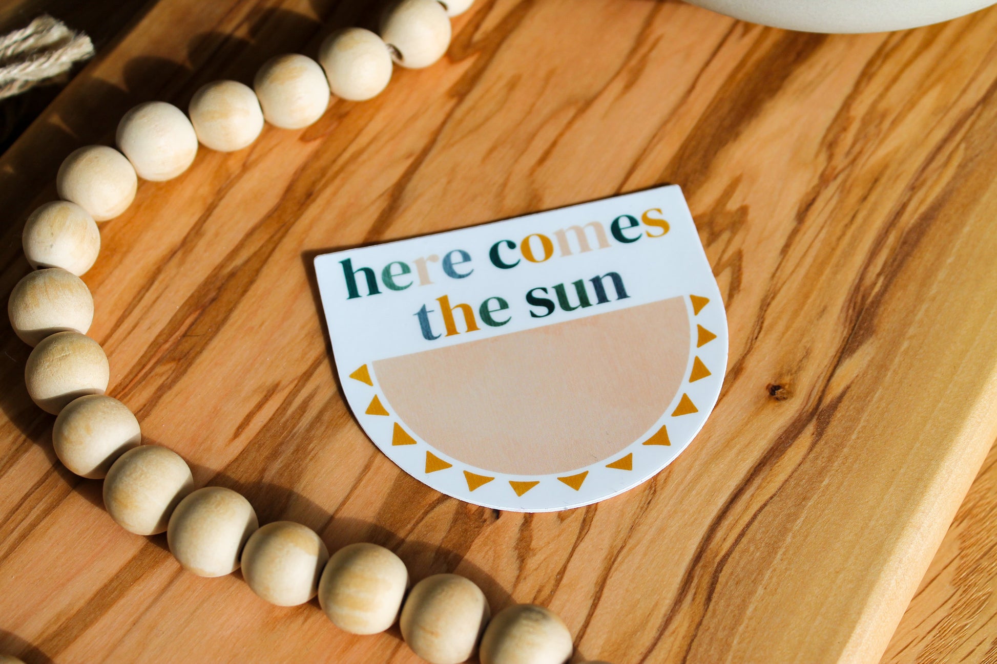 Feeling down? Don't worry, our 'Here comes the sun' sticker is here to cheer you up! It's a playful reminder that the sun will shine again. No need to fret - we've got just the thing to brighten your day! This sticker will keep you in good spirits and remind you that sunny days are ahead (literally). Place it somewhere to bring you happiness and make you smile.