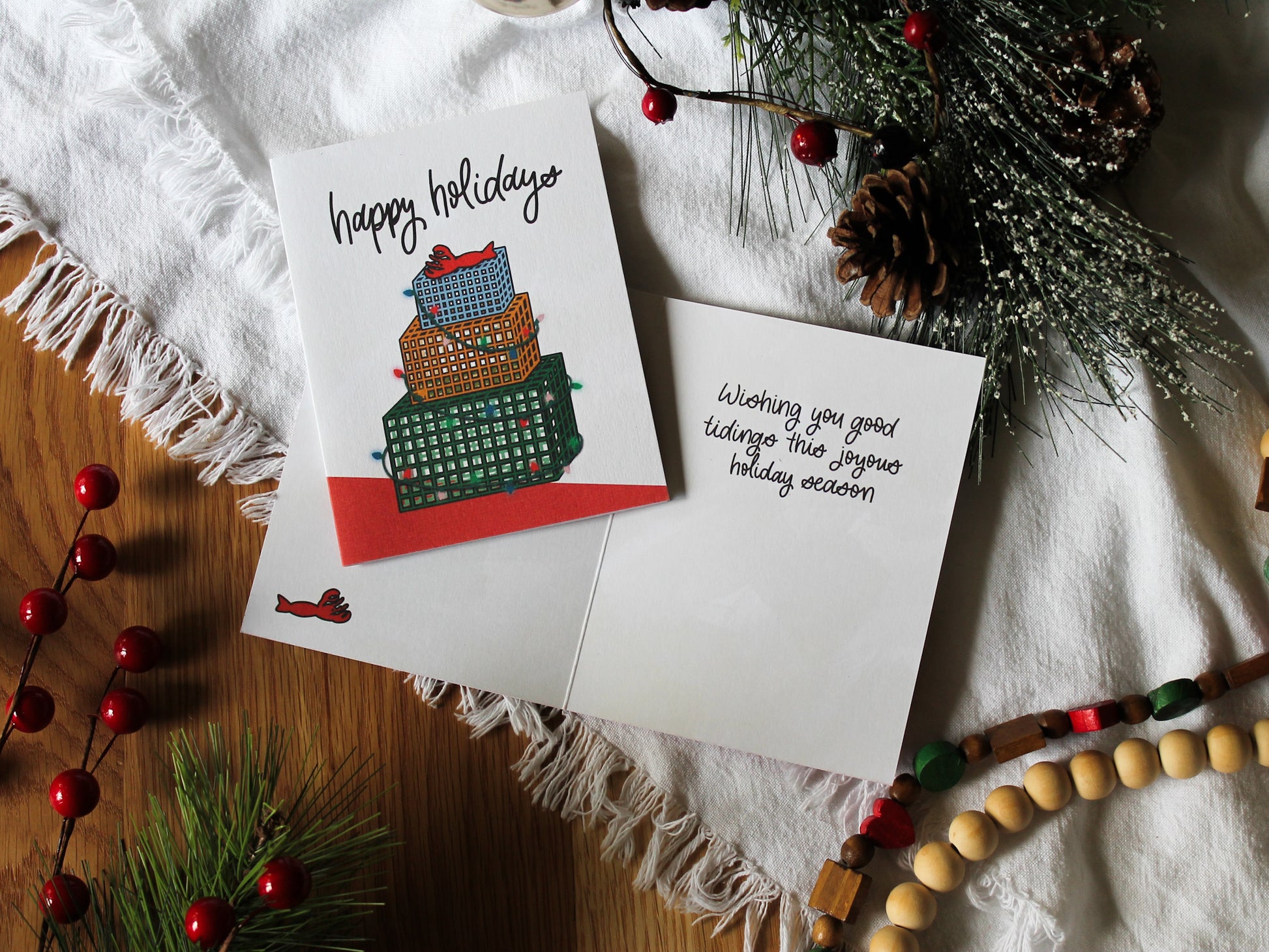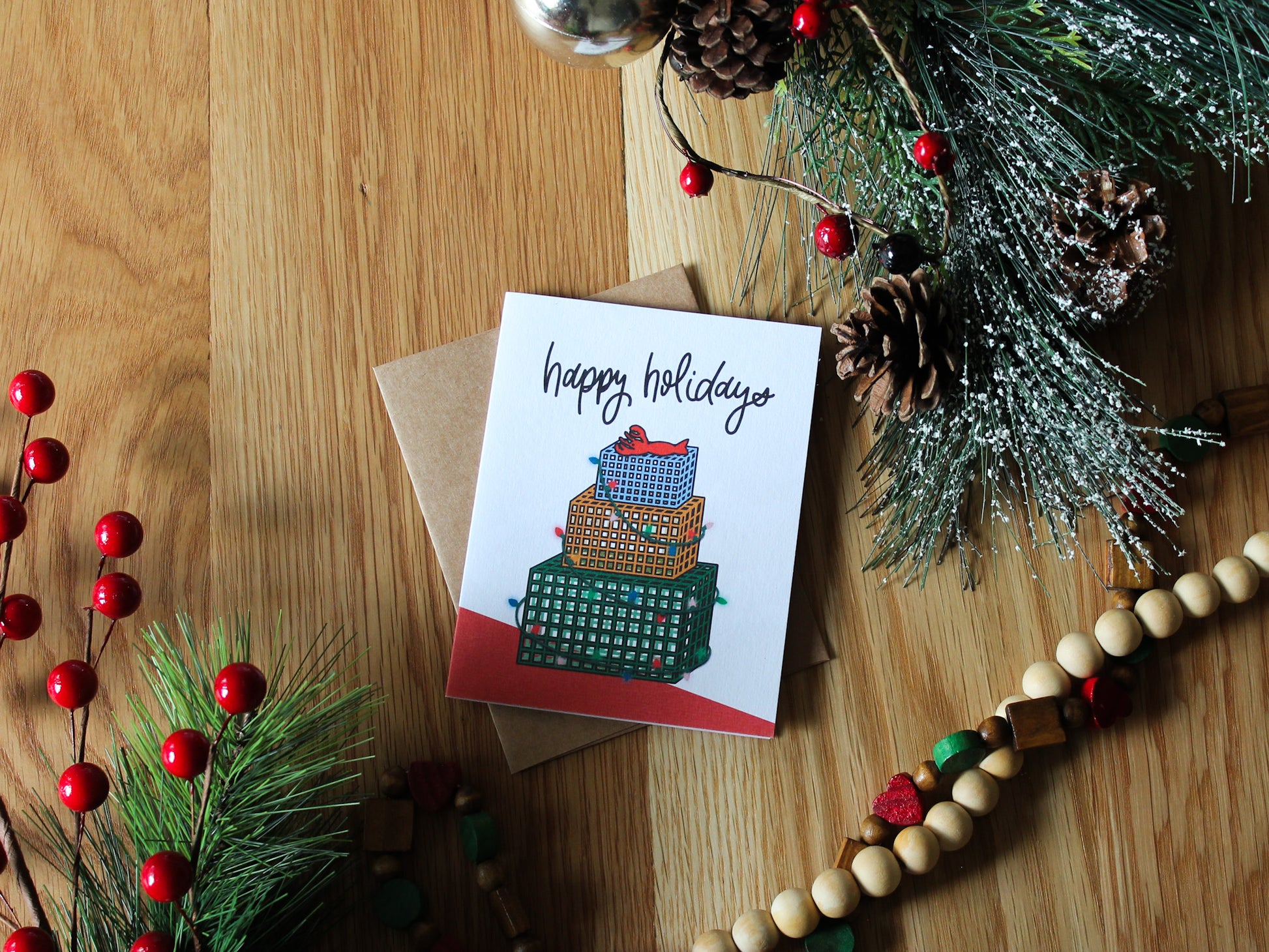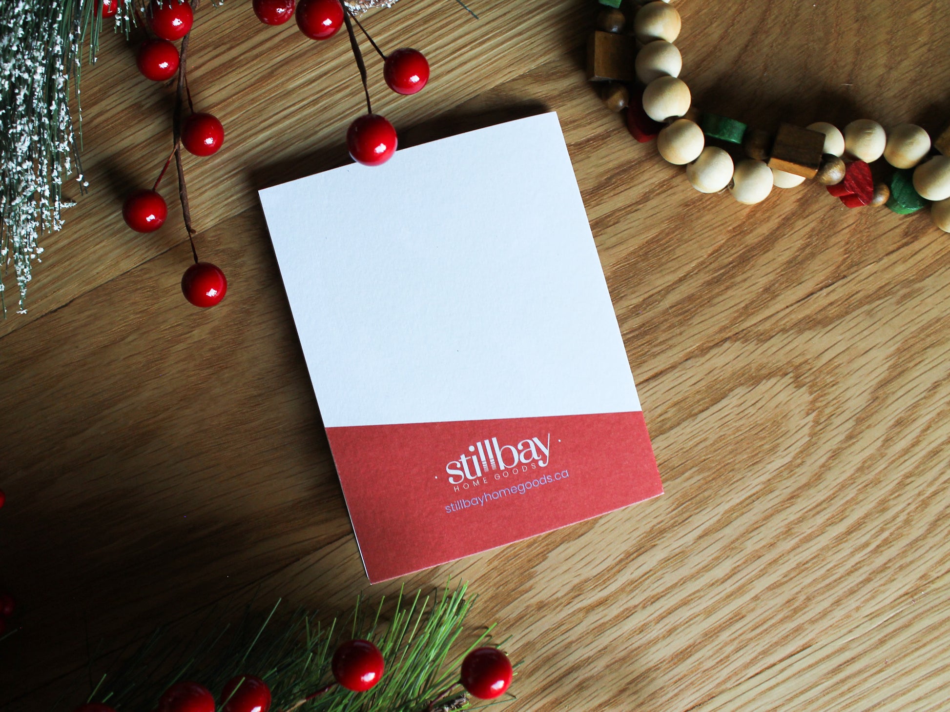 The "Lobster Traps" card perfectly captures the coastal charm of Canada's Maritimes during the holidays. This exclusive Christmas card features original art by Hilary of Stillbay Home Goods and is inspired by the annual lobster trap tree on the beautiful waterfront of Lunenburg, Nova Scotia. Our "Lobster Traps" card is designed in the lobster capital of Canada, and printed on eco-friendly paper.