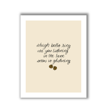 This 8×10 print is not your average Christmas print. Featuring a neutral colour palette and beautiful hand-lettering of the phrases "sleigh bells ring are you listening, in the lane snow is glistening", this print is subtly festive. Display on its own or pair it with others to form a trio or gallery wall.