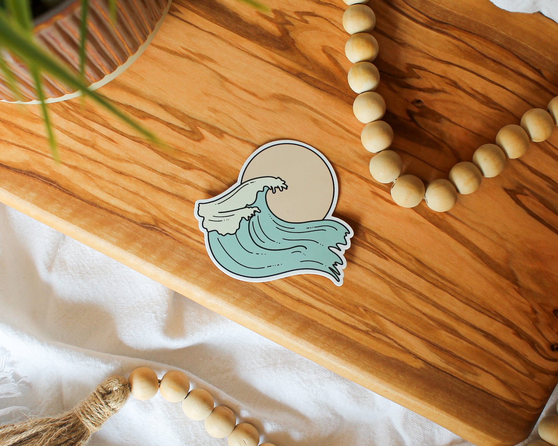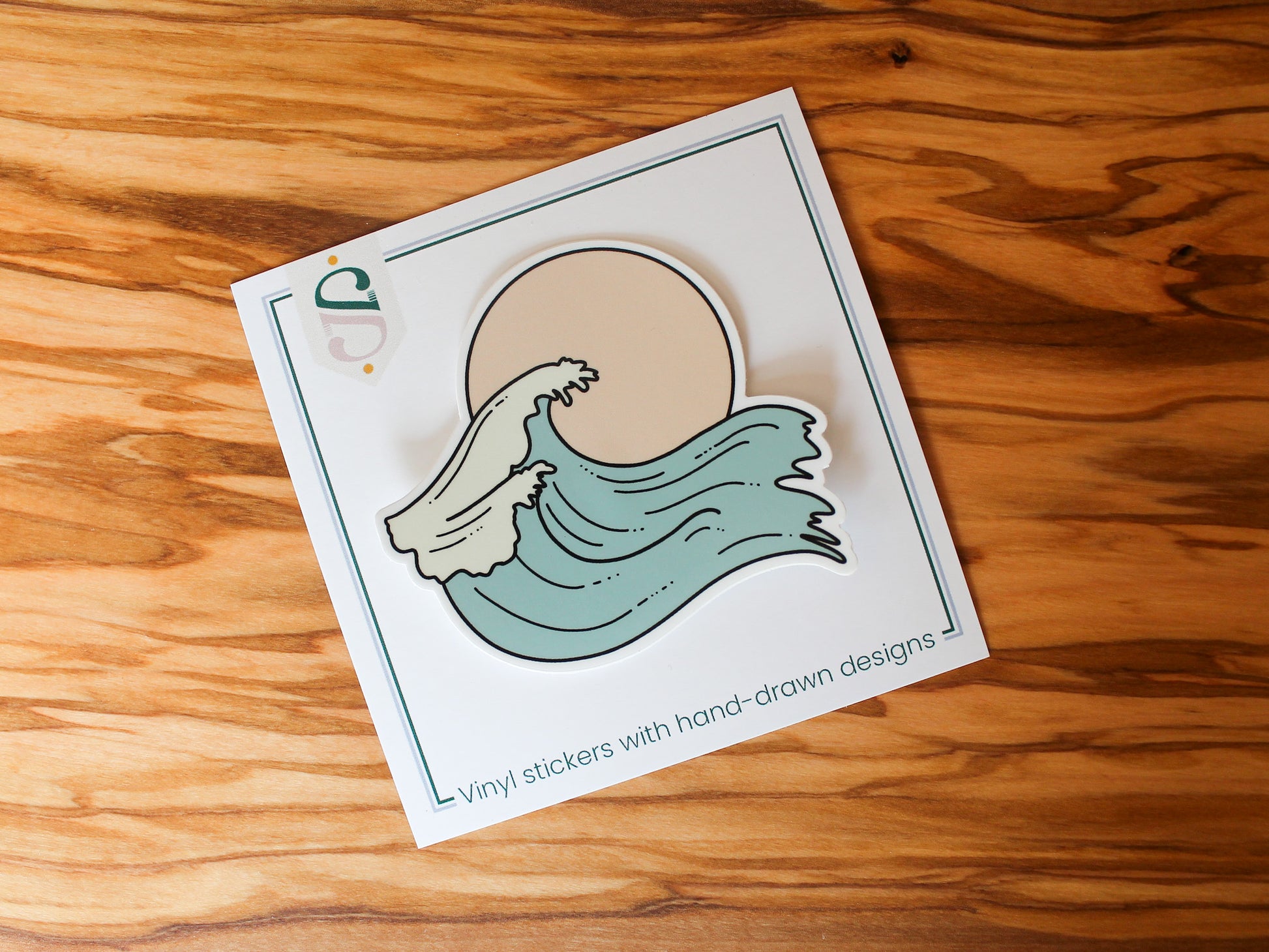 This coastal sticker features a hand-drawn waves with a pink sun in behind. Place it somewhere to bring you happiness and make you smile. Measures 3x2.72".